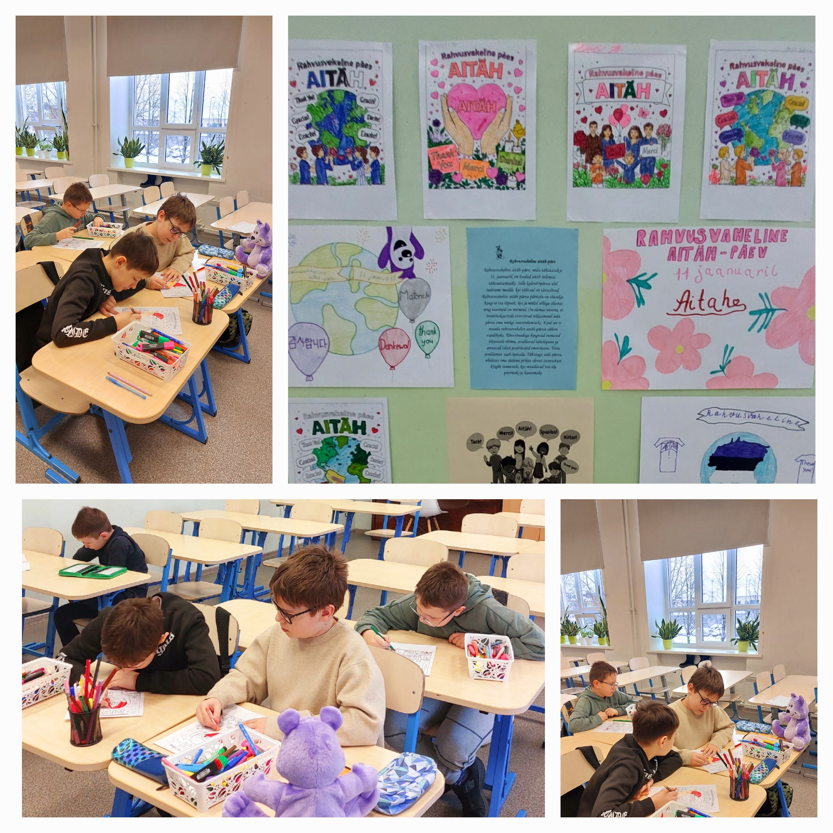 Rahvusvaheline „Aitäh“ päevRahvusvaheline „Aitäh“ päev 11. jaanuaril tähistatakse kogu maailmas rahvusvahelist „Aitäh“ päeva, mis tuletab meelde viisakuse, tänulikkuse ja üksteise suhtes lugupidava suhtumise olulisust. Selle päeva tähistamise raames toimusid 8. ja 9. jaanuaril tegevused 3.B, 4.A, 4.B ja 7.A klassides. Õpilased tutvusid „Aitäh“ päeva ajaloo ja tähendusega ning kasutasid aktiivselt eesti keeles viisakusväljendeid. Tundides täideti mitmekesiseid õppe- ja loovülesandeid: otsiti tänusõnu, töötati töölehega „Märka head“, arvestati, mitu korda päeva jooksul öeldi „aitäh“, ning arutleti, kellele ja mille eest tänu avaldati. Tegevuste tulemusena valmisid värvikad joonistused, mis olid pühendatud rahvusvahelisele „Aitäh“ päevale. Kõik läbiviidud tegevused vastavad programmi „Kiusamisest vabaks!“ eesmärkidele (MTÜ Lastekaitse Liit) ning toetavad turvalise ja hooliva koolikeskkonna kujundamist.