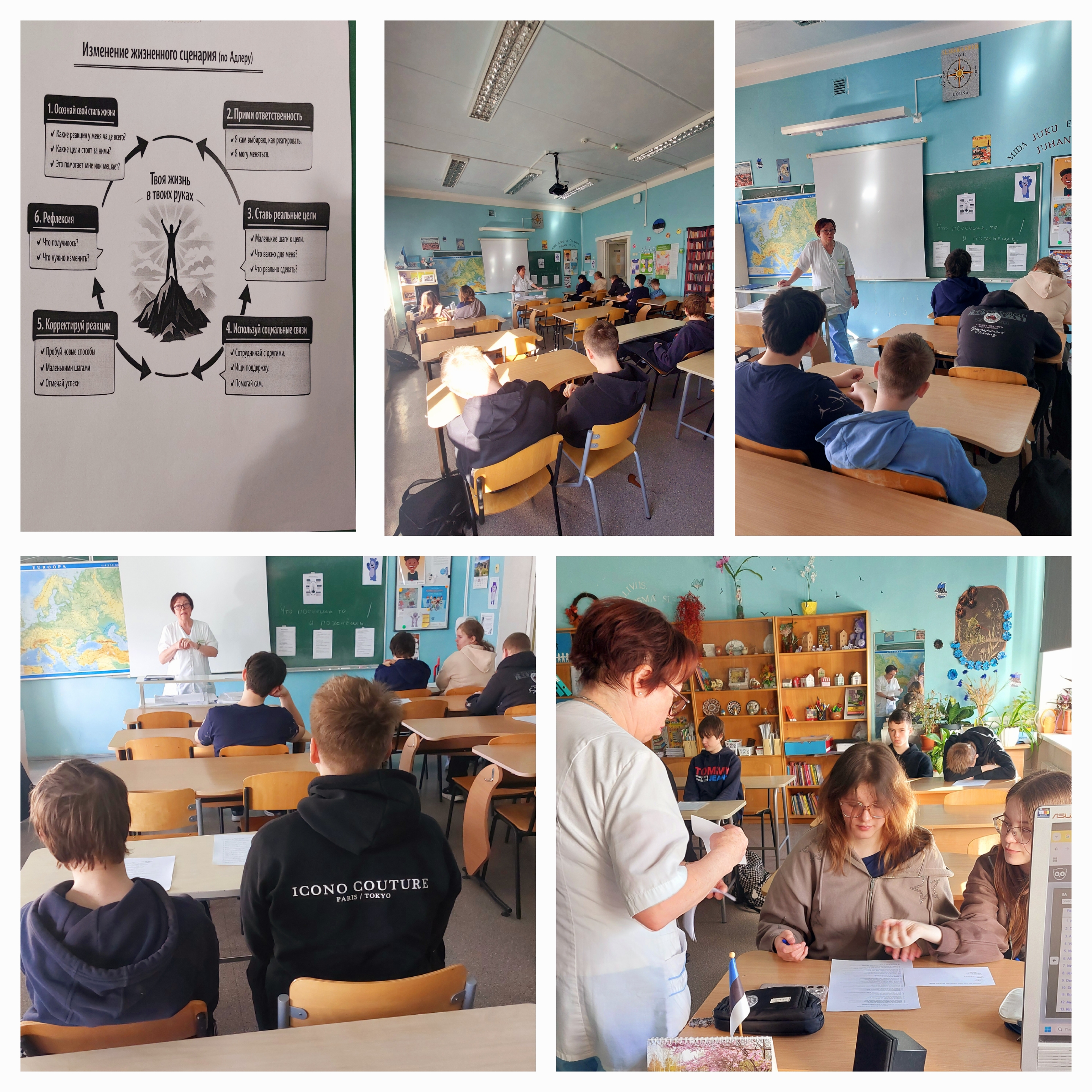 Programm „Tervise valem: õpime õigesti elama“Programm «Tervise valem: õpime õigesti elama» „Tervise saladused noortele“ Eile tähistati kogu maailmas Maailma tervisepäeva, kuid täna, 8. aprillil, jätkasid 8.A klassi õpilased arutelu kõige olulisema üle — tervise teemal. Tund toimus koos kooli meditsiiniõe Marina Punžinaga — suure kogemusega spetsialistiga, inimesega, kes on aastaid töötanud lastega ja teab, kui oluline on rääkida noorukitega õigel ajal tõsistel teemadel. Kaheksas klass on eriline periood. Üleminekuiga, emotsionaalne koormus, väsimus pärast pikka talve, vitamiinide puudus ja loomulikult ootus koolivaheajale — kõik see mõjutab õpilaste enesetunnet ja meeleolu. Just seetõttu on sellised kohtumised eriti olulised just praegu. Tunni käigus kuulasid õpilased tähelepanelikult, esitasid küsimusi ja arutasid teemasid, mis puudutavad otseselt nende igapäevaelu: kuidas hoida tervist, miks on oluline päevarežiim, tasakaalustatud toitumine ja puhkus ning kuidas tulla toime stressiga. Pärast vestlust täitsid õpilased spetsiaalse 46 küsimusest koosneva küsimustiku. See aitas igal ühel mõelda oma harjumuste, eluviisi ja suhtumise üle oma tervisesse. Sellised tunnid ei ole lihtsalt õppetunnid, vaid oluline samm teadliku enesesse suhtumise kujundamisel. Sest tervis algab tõepoolest teadmistest — ja mida varem seda mõistad, seda tugevam on vundament tulevikuks.