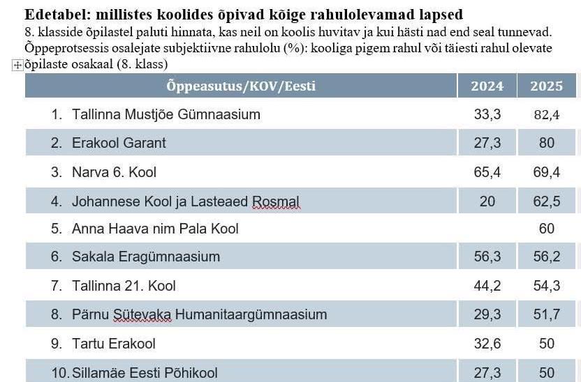 Kuulume parimate hulka!Kuulume parimate hulka! Narva 6. Kool on jõudnud Eesti koolide hulka, kus õpilaste rahulolu on kõrgel tasemel. Haridus- ja Noorteamet poolt läbi viidud 8. klassi õpilaste rahuloluküsitluse põhjal tundis 2025. aastal 69,4% meie õpilastest end koolis hästi ning osales õppetöös huviga. 2024. aastal oli sama näitaja 65,4%, mis näitab positiivset arengut. Oluline on rõhutada, et tulemused kajastavad õpilaste hinnangut 8. klassi õppeperioodi keskel, mis on üks olulisemaid etappe kooliteel. Samas mõistame, et meie ees seisab palju olulisi eesmärke. Nende hulgas on põhikooli lõpueksamite tulemused, tasemetööde tulemused, eesti keele oskuse tase ning üleminek eestikeelsele õppele. Nendes valdkondades jätkub järjepidev ja sihipärane töö. Peame oluliseks märgata ja väärtustada ka saavutatud tulemusi. Positiivsed näitajad kinnitavad, et liigume õiges suunas.
